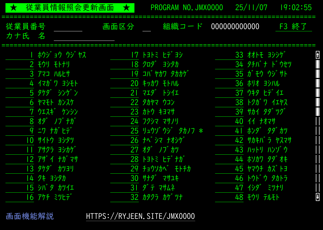前項の表示の際、退職者は飛ばされますが、退職者を飛ばさずに表示させたい場合は、F14キー(Shift+F2)を打鍵しておきます。再度F14キー打鍵で機能解除されます。機能稼働中は画面1行目のプログラム番号の左側に「*」が高輝度(=白)で表示されます。